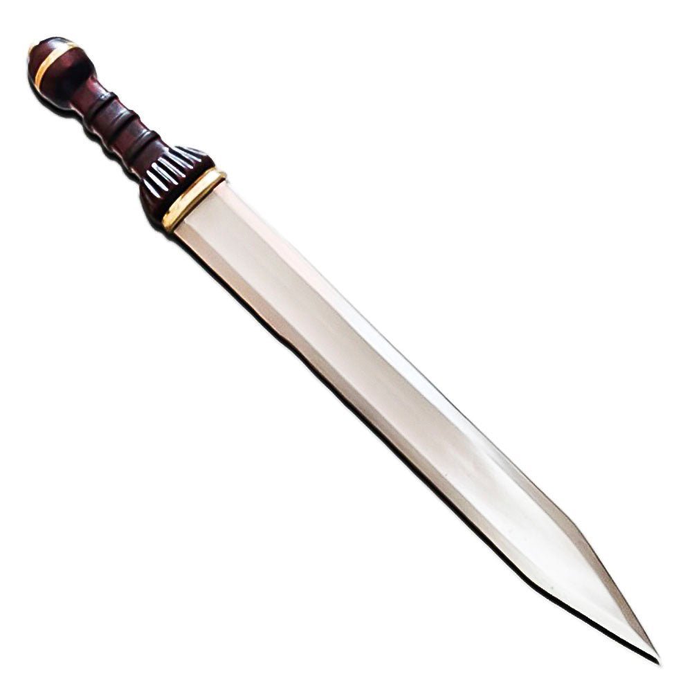 The blade is double-edged with a sharp, pointed tip, designed for both slashing and thrusting, mimicking the effectiveness of ancient Roman short swords. The wooden handle, wrapped in genuine leather, provides a firm and comfortable grip, while the solid brass or steel guard and pommel enhance balance and historical appeal.
