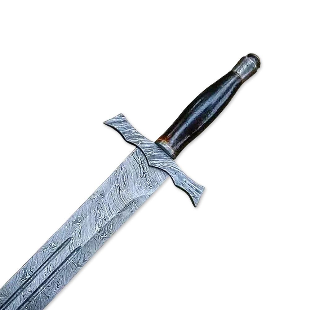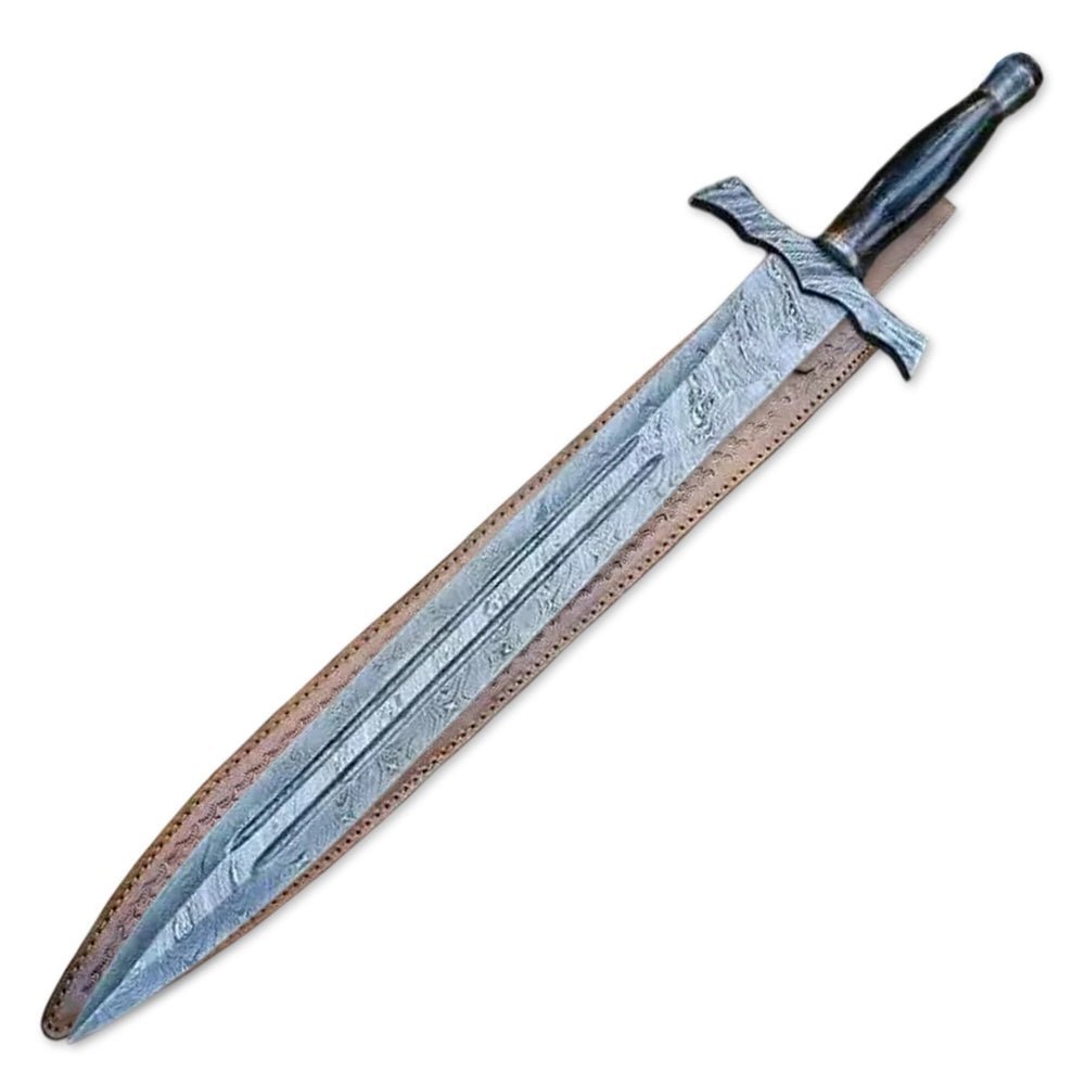 Forged from high-quality Damascus steel, the blade showcases a mesmerizing wave-like pattern, a result of meticulous folding and hammering techniques. This process enhances the steel’s strength, sharpness, and durability, making it an excellent choice for hunting, display, or tactical use. The razor-sharp edge ensures precision cutting, while the 30-inch length provides an imposing yet balanced feel.