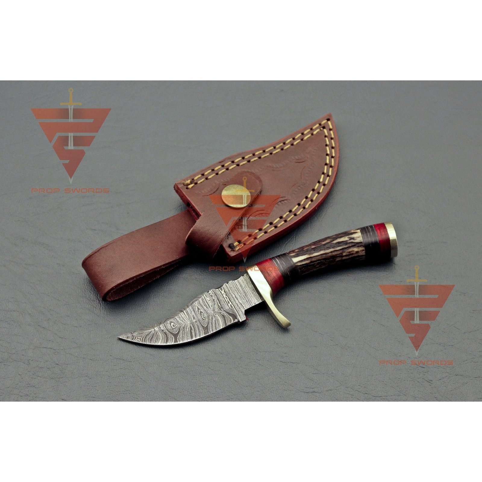6 inches Handmade Stag Horn Hunting Knife – Crafted with Premium Damascus Steel and Complete with a Leather Sheath