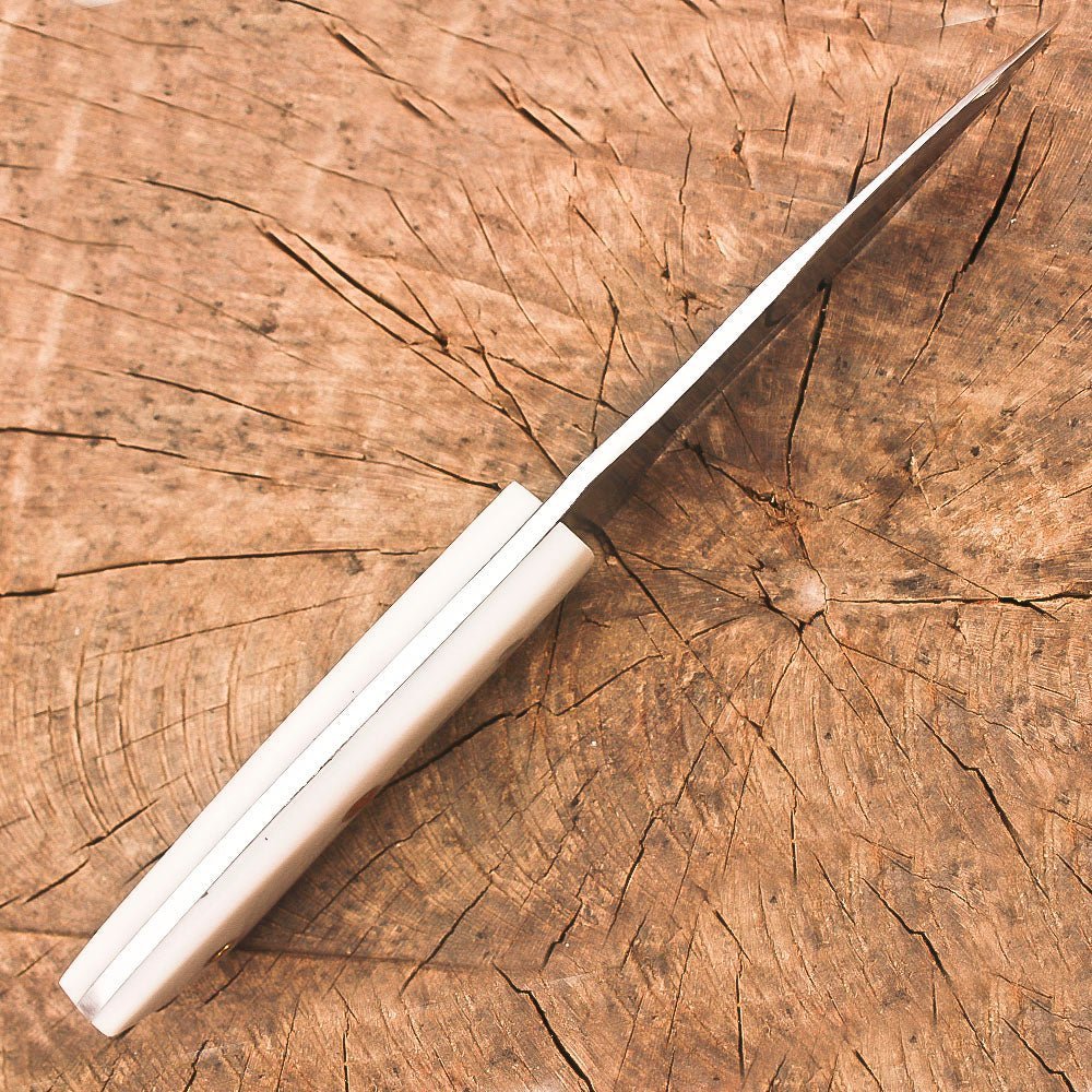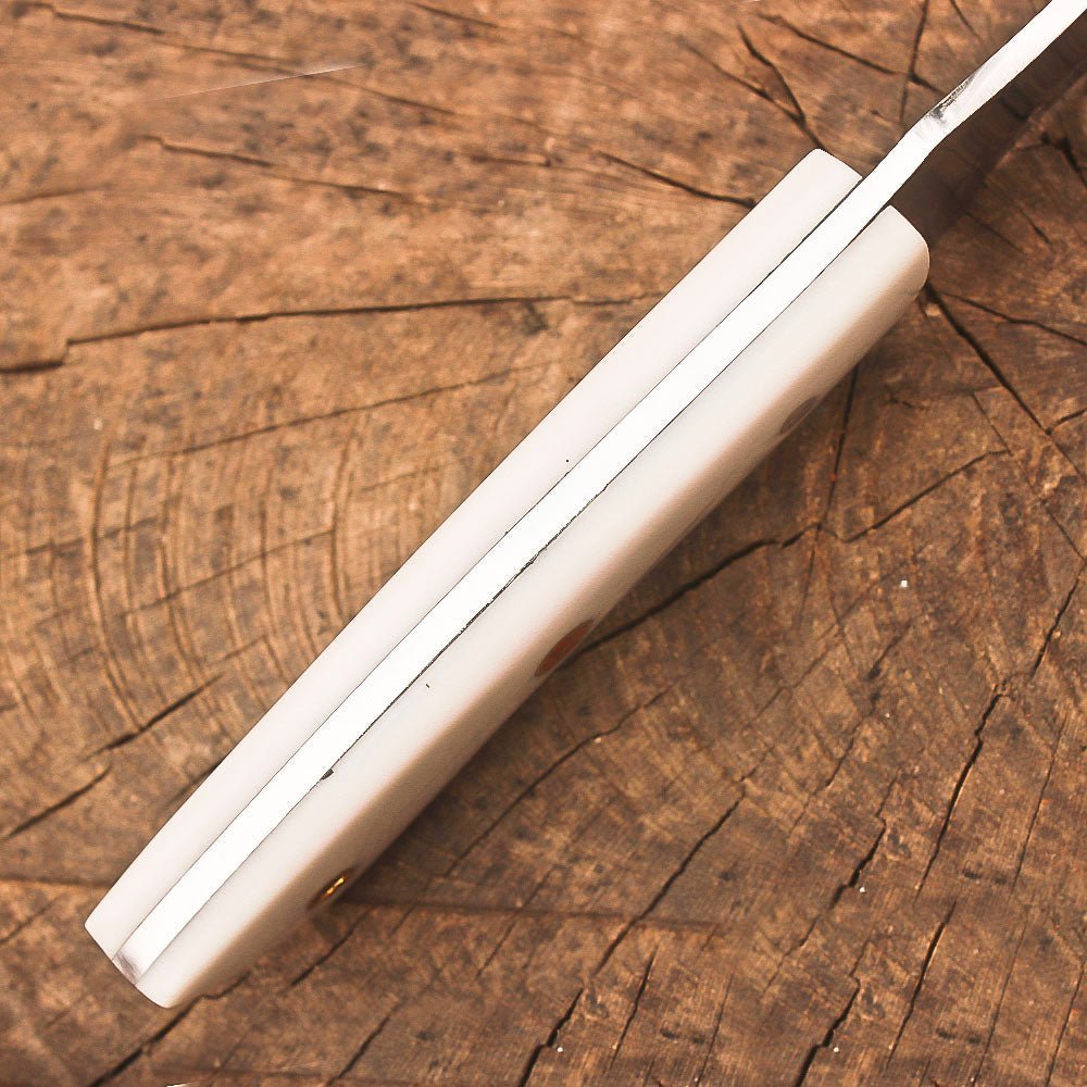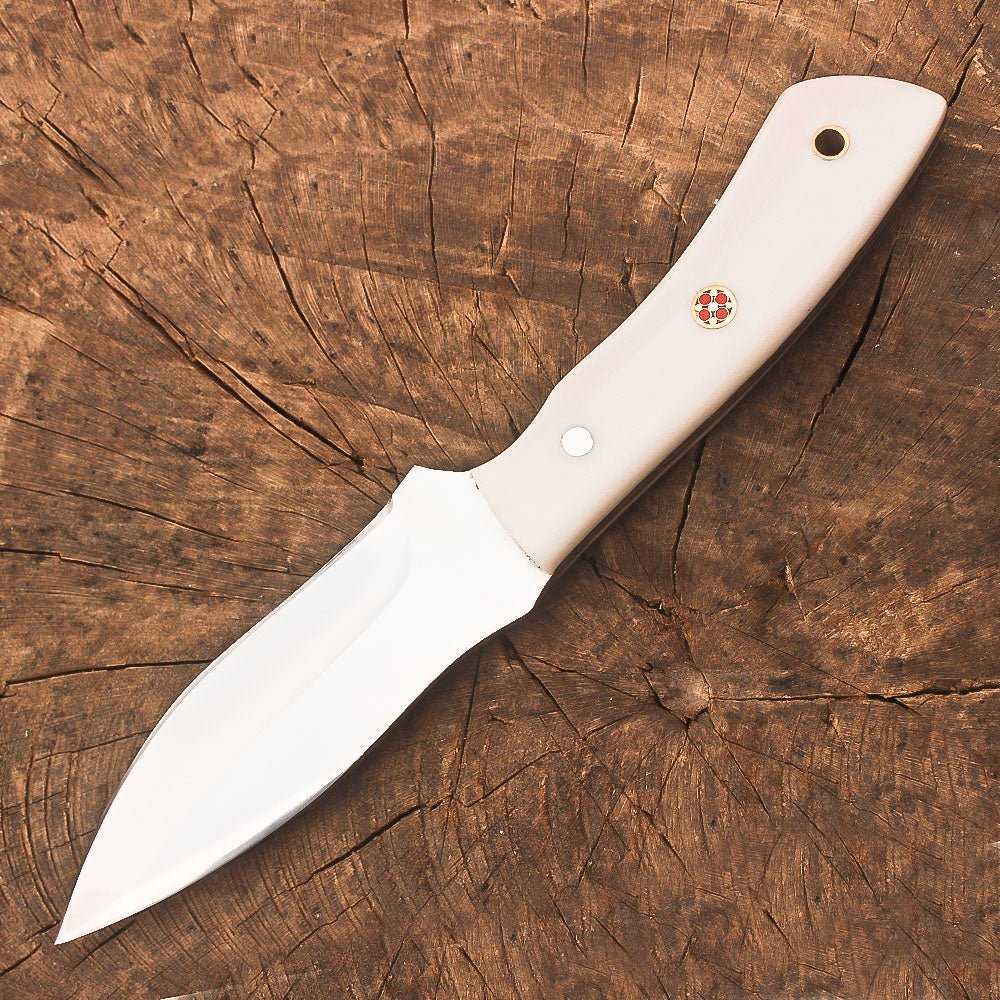 Handmade stainless steel 9-inch fixed blade hunting knife. Crafted with precision, this full tang skinner features a premium stainless steel blade that maintains its edge and resists corrosion. The white resin handle provides excellent grip and control during use, while its ergonomic design ensures comfortable handling during extended periods. The knife comes complete with a beautifully crafted leather sheath, featuring detailed stitching and a secure fit for safe carrying. Perfect for bushcraft, hunting, camping, and survival activities, this versatile knife is built to handle demanding outdoor tasks. The full tang construction extends through the entire handle, delivering exceptional durability and strength for reliable performance in challenging conditions. Whether you’re field dressing game, preparing camp, or handling general outdoor cutting tasks, this knife is ready for action. The classic design combines functionality with rugged elegance, making it a dependable companion for outdoor enthusiasts.