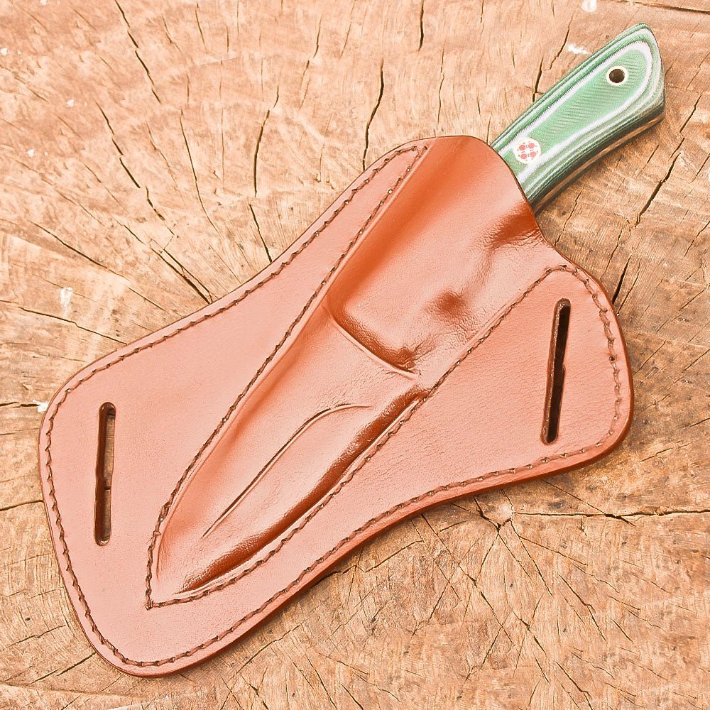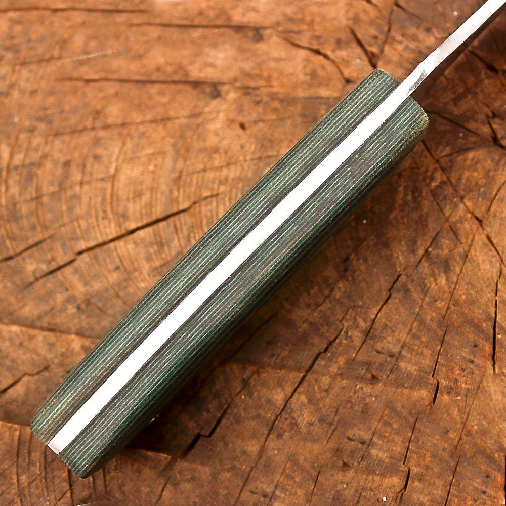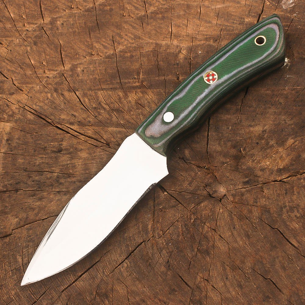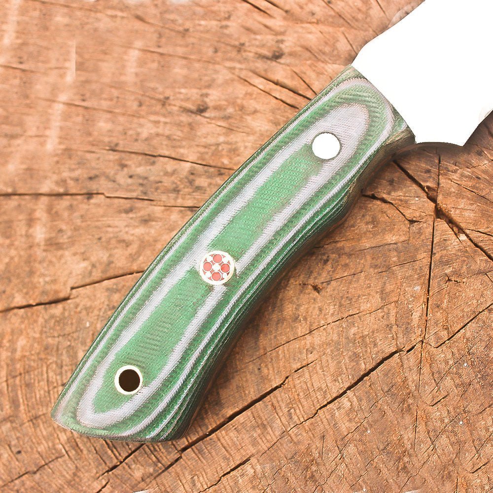 Handmade stainless steel 9-inch fixed blade hunting knife. Crafted with a full tang stainless steel construction, this skinner knife delivers exceptional durability and balance for all your outdoor adventures. The ergonomic green Micarta handle provides a secure, comfortable grip in any weather condition, while the carefully designed blade profile excels at skinning and general bushcraft tasks. The knife comes complete with a handcrafted leather sheath featuring precise stitching and a practical design for secure carry and easy access. Whether you’re processing game, setting up camp, or handling survival tasks, this versatile fixed blade knife is ready to perform. The robust construction and thoughtful design make it an essential companion for hunters, outdoor enthusiasts, and wilderness explorers. The substantial 9-inch size offers the ideal combination of control and cutting power for demanding outdoor use.