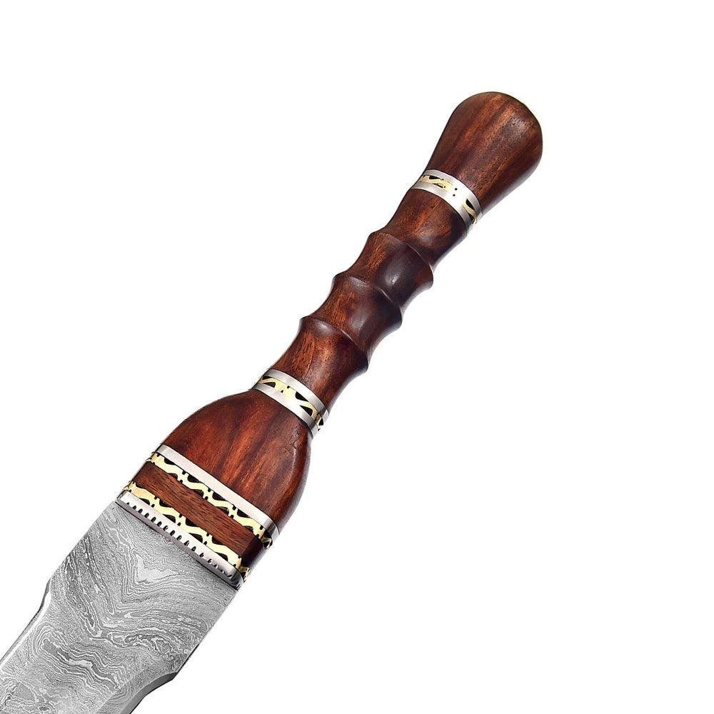 Handmade Damascus Steel Roman-inspired gladius replica sword is used to represent the primitive roman foot soldiers. The Gladius was one of the most popular weapon types among Roman Legions and Gladiators alike. Its short, stif blade is good for breaking a spear and intense forward stabbing thrusts. The gladius ruled close combat fighting for many centuries. The blade is made of 1095/15N20 Damascus Steel that has been folded & layered approximately 400-520. The handle is made of Rose wood with steel and brass spacers. Sword comes with an included leather sheath.