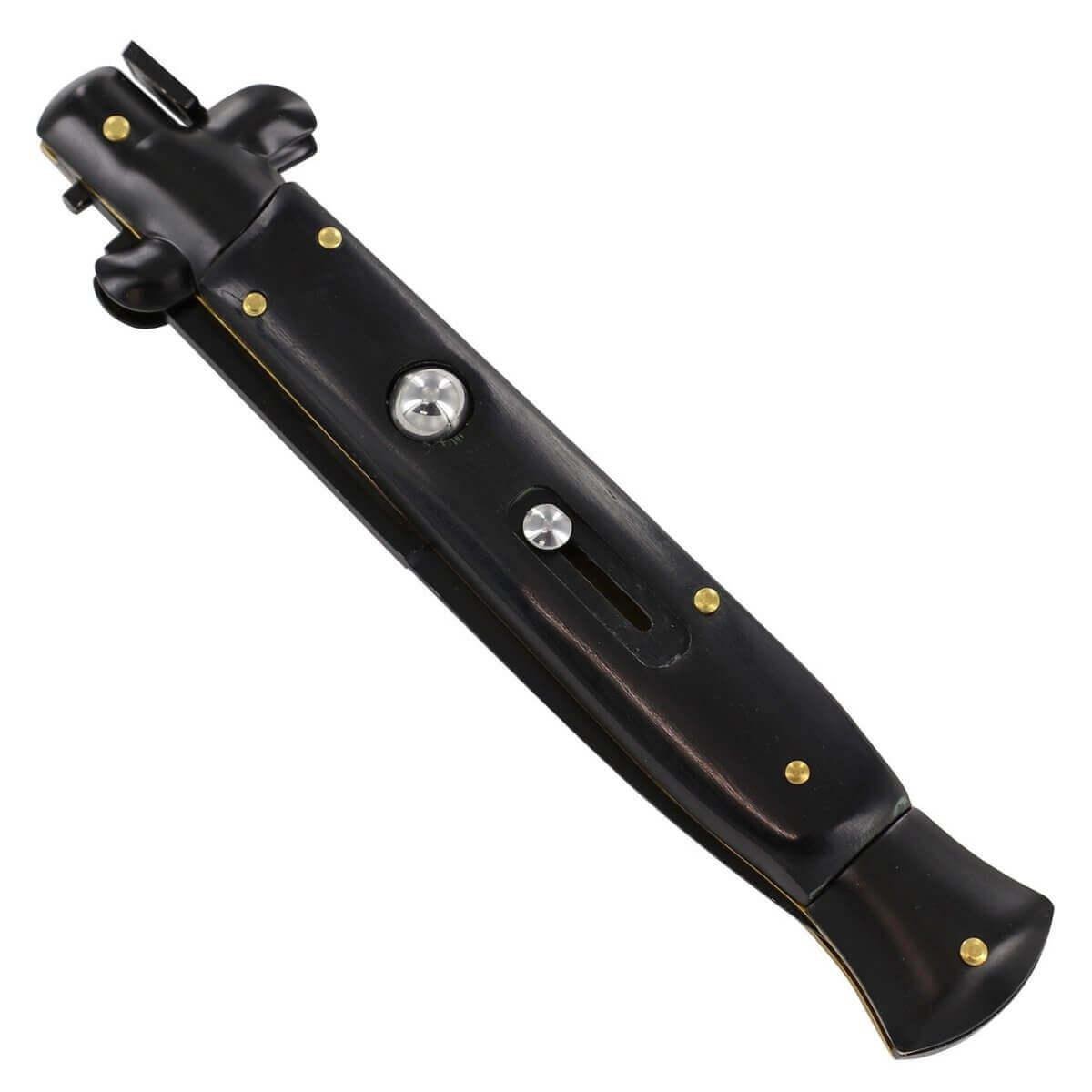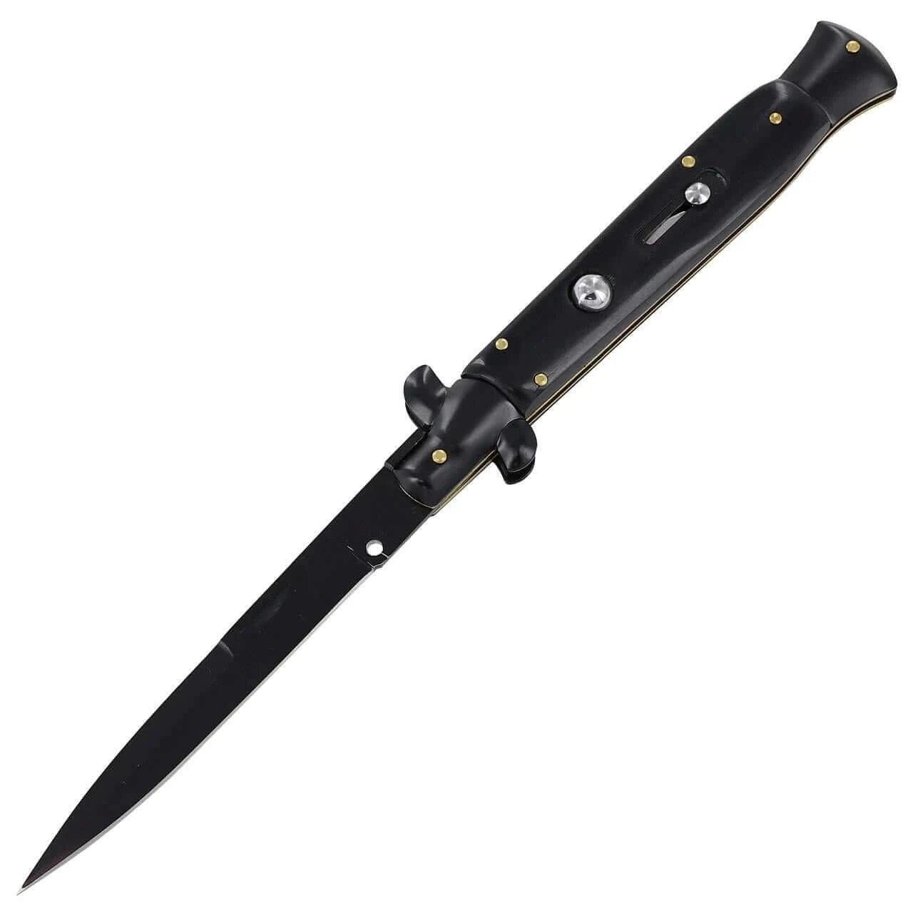 This smooth programmed blade undoubtedly strikes a chord when you consider an exemplary stiletto. Feel on top of the world with this lovely extra-long knife style cutting edge fashioned from hardened steel, so there is no concern of rusting. A dark anodized covering on the sharp edge gives a much more in-vogue appearance. The built-up handle has a metal edge with metal pins, a silver terminating button, and a wellbeing lock component to keep the blade from accidentally opening in your pocket. The mounts on the handle are ABS with a sharp dark shading. The support and knob likewise have an anodized dark completion for a smooth look. Included is FREE dark nylon with a waistband for capacity.