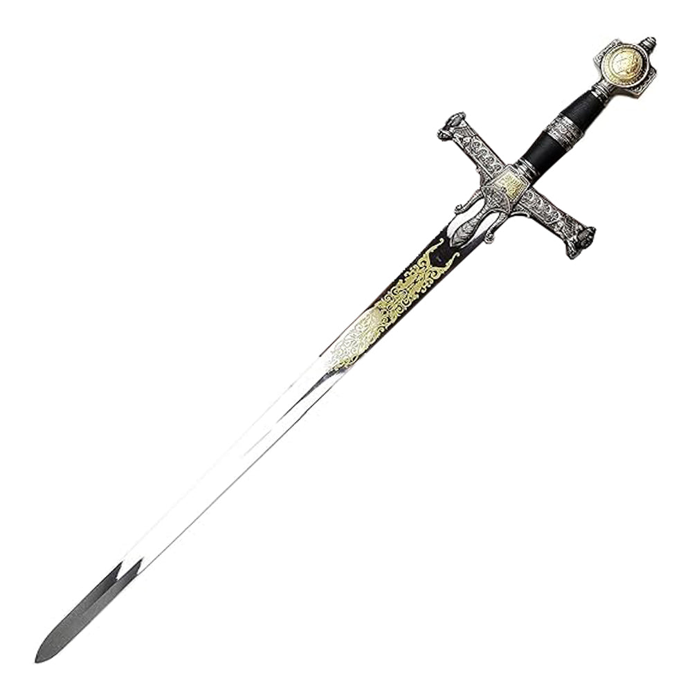 This is a King Solomon Sword.The sword includes a Wooden Plaque and black plastic tip case.Attributes of the Weapon:Blade: The blade of the sword is polished stainless steel with a dulled edge and sharp point. A long ricasso runs up from the base of the blade, painted on the ricasso is complex scroll work of leaves and vines. Guard: A long languet runs down the ricasso with a detailed pattern. The ends of the quillons are Persian Sphinxes wearing a kippah on their heads. In the middle of the cross guard is the Star of David underneath a Menorah. The guard and pommel are golden.Handle: The handle is ringed with imitation ivory framing a red leather grip. The pommel of the sword is solid steel with a large Star of David.