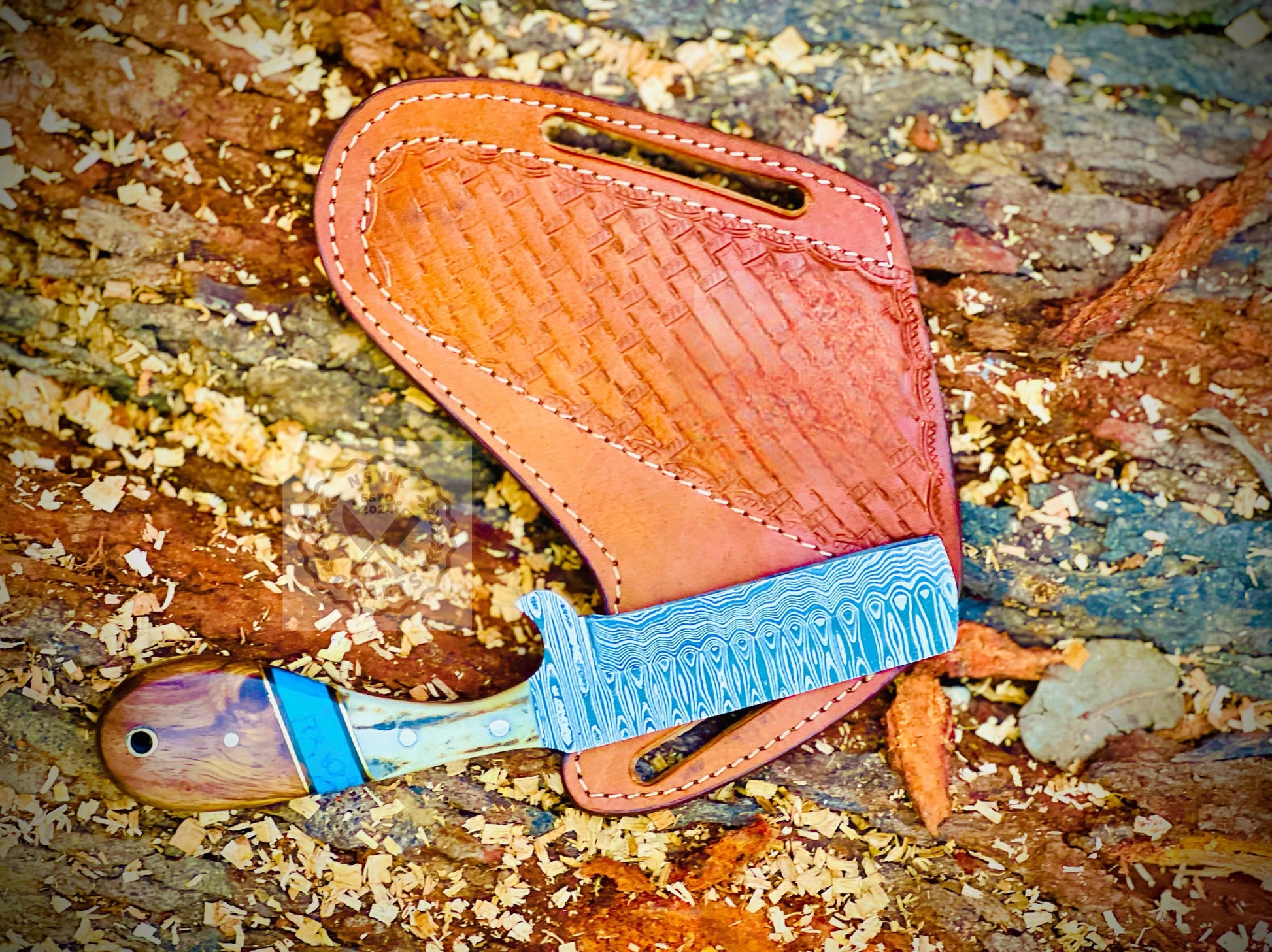 Complemented by a rugged handle for a firm, secure grip, this knife is as functional as it is visually impressive. It comes complete with a hand-stitched genuine leather sheath, offering safe storage and convenient belt carry.