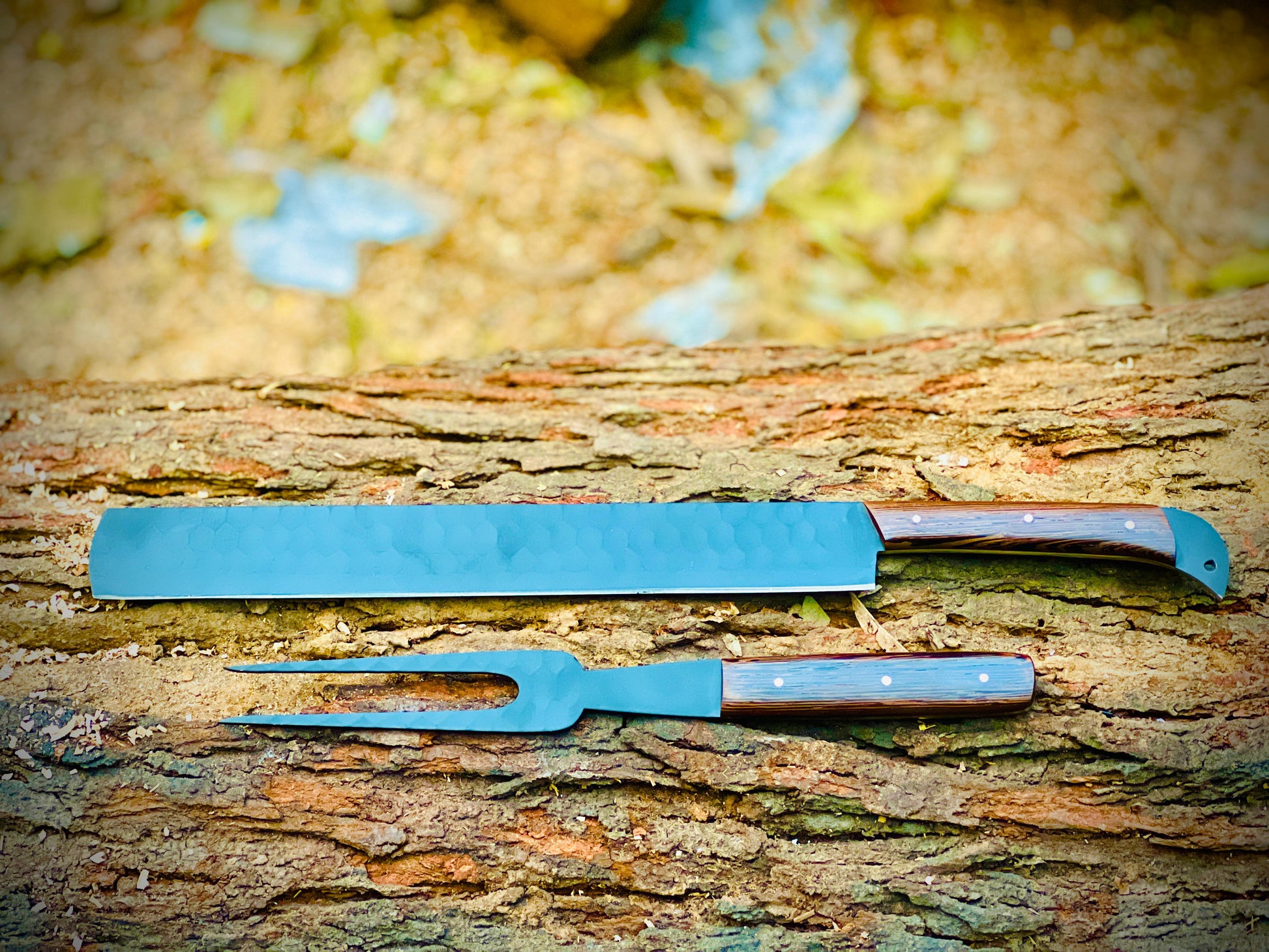The carving knife and fork duo is perfect for slicing large roasts, poultry, and briskets with elegance and control.